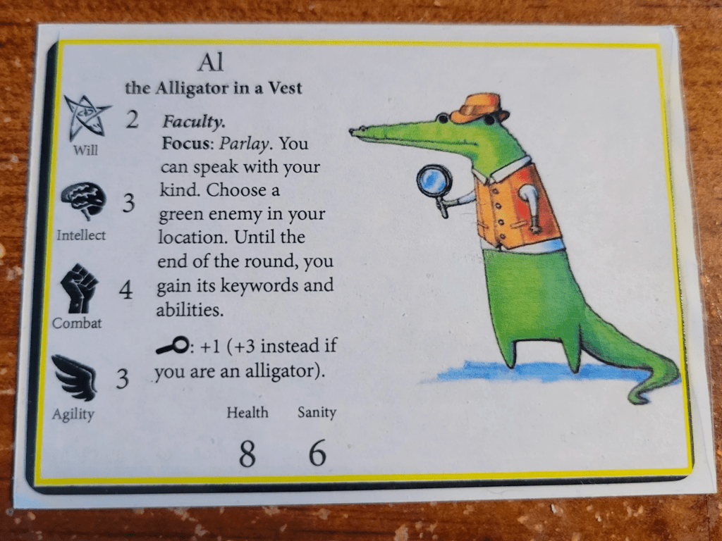 Эл (аллигатор в жилетике). Кафедра. Воля: 2, интеллект: 3, сила: 4, ловкость: 3. Фокус: Пиреговоры. Можете пообщаться с себе подобными. Выберите зелёного врага в своей локации. До конца раунда вы получаете его черту и свойства. Эффект улики: +1 (+3, если вы аллигатор). Здоровье: 8, рассудок: 6.