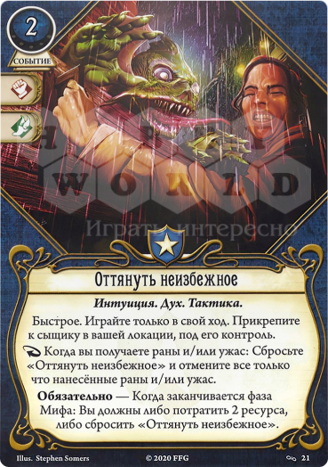 Разыгрываем событие, прикрепляем «Оттянуть неизбежное» к сыщику, оно срабатывает (например в фазу врагов), попадает под Диану, что даёт нам карту и ресурс.