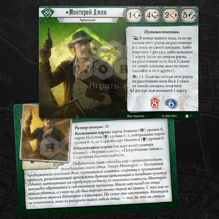 Если говорить об отыгрыше, мы хотели бы, что игра за Монти была в чём-то схожа с игрой за Урсулу. Мы хотели, чтобы он метался по всей карте, каждый ход перемещаясь из локации в локацию и получая за это награды. Стоит заметить, что в картах Монтерея нет ничего, что напрямую помогает ему перемещаться (та же ситуация у Урсулы), только награды за оное перемещение. Ответ на вопрос «почему?» вы можете найти под №3 в списке выше. Способность, которая помогает сыщику экономить действия на перемещении никак не мотивирует вас собирать ему колоду так или иначе. Вы соберёте такому сыщику Просто Хорошую Колоду (тм) и будете экономить действия на перемещении. Напротив, дизайн Монти умоляет вас включить в колоду карты, помогающие ему постоянно перемещаться, чтобы получить максимальную пользу от его способности.