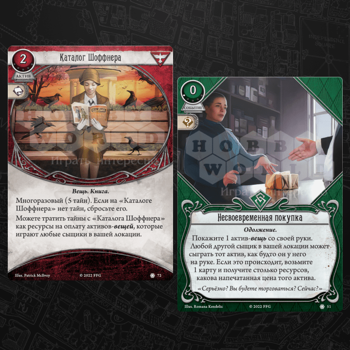 В дизайне таких карт есть определённая сложность, ведь мы не хотим создавать карту только под одного конкретного сыщика. Мы хотим, чтобы каждая карта могла занять своё место в пуле карт и пригодиться ранее выходившим сыщикам. Возьмём тот же «Каталог Шоффнера» — это карта Выжившего, использующая тайны. Поэтому, например, Минь могла бы использовать её для всяких махинаций с активами, использующими тайны. Кроме того, это дешёвая книга, не занимающая слоты, — альтернативная Дейзи такое любит! (Что такое альтернативные сыщики?) В конце концов, это неплохая карта на ресурсную экономику, любой Выживший, активно использующий вещи, ей порадуется — например, Йорик.