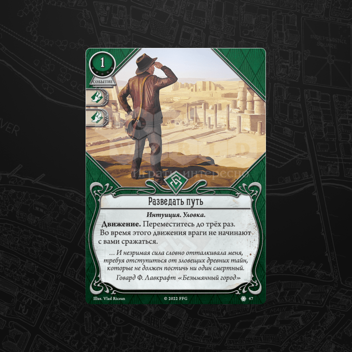 «Разведать путь» — это такой «Короткий путь» для Ловкачей, но с парой нюансов: 1) стоит 1 ресурс 2) стоит действия 3) можно разыграть только на себя. Может показаться, что карты очень похожи (помогают перемещаться и экономят действия), но на практике они сильно разнятся! «Короткий путь» хорош для решения проблем, ведь он быстрый и может быть разыгран на любого сыщика. Это помогает выпутываться из передряг. «Разведать путь», в свою очередь, помогает вам переместиться с одного конца карты на другой, игнорируя встречающихся по пути врагов. Это полезно, если вам нужно добраться до чего-то, оказавшегося «в самой дальней от сыщиков локации», или просто сбежать подальше!