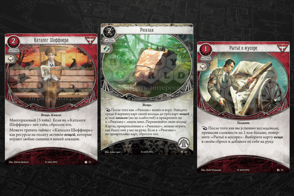 Это наш «слот под добор». У Рекса классная персональная карта, которая может добрать аж 5 карт, но она, к сожалению, только одна. В грядущем допе «Заговор в Инсмуте» у зарисовок будет классная альтернатива, но пока могу предложить только «Жуткий тотем», который опять же улучшается через нору и начинает приносить карты в обмен на добавление навыков к проверкам (но конфликтует по слоту со схемой), или «Пищу для ума» из колоды Харви Уолтерса — обычно у искателей нет лишних действий на это баловство, но у вас-то есть!