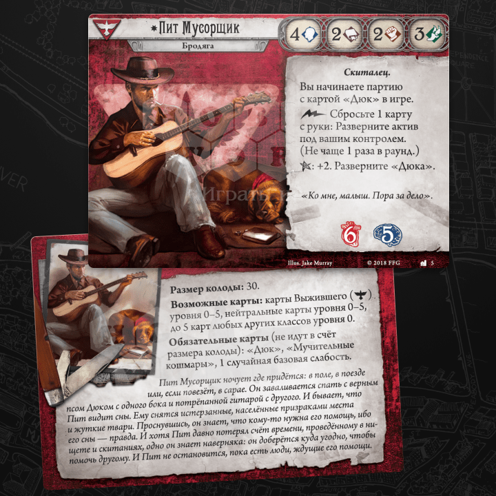 «Побираться» позволяет вернуть любую карту уровня 0 из сброса. Неплохо, но не работает с персональными картами сыщиков, потому что они не имеют уровня.