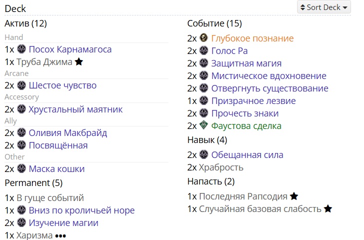 При прокачке главная задача — как можно быстрее получить Шестое чувство (4) ×2. Благодаря мета рабским картам, это возможно уже после первого сценария.