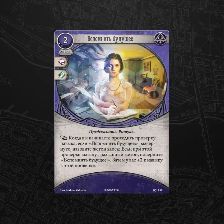 Закономерный вопрос — а как проходить проверки, ведь два жетона в два раза хуже, чем один — и для этого у нас есть мощное комбо из двух Вспомнить будущее (2), с которыми отлично сочетается Хрустальный маятник, обеспечивающий добор карт.